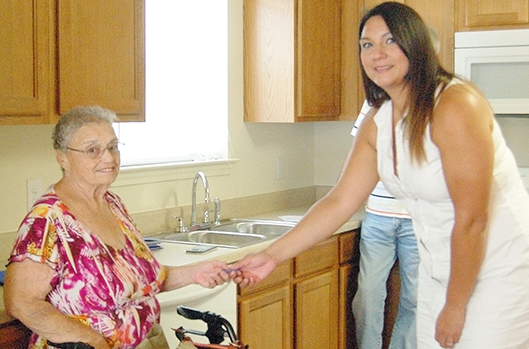 Maria Resio (L) receives the key to her newly built home in Tynan from Bee County Judge Stephanie Silvas. The judge was among the first to visit Resio and her husband, Manuel, after the home was built through the HOME Program.
